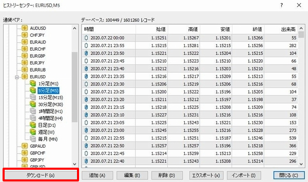取得したい時間足をダブルクリックして「ダウンロード」をクリックしてください。
